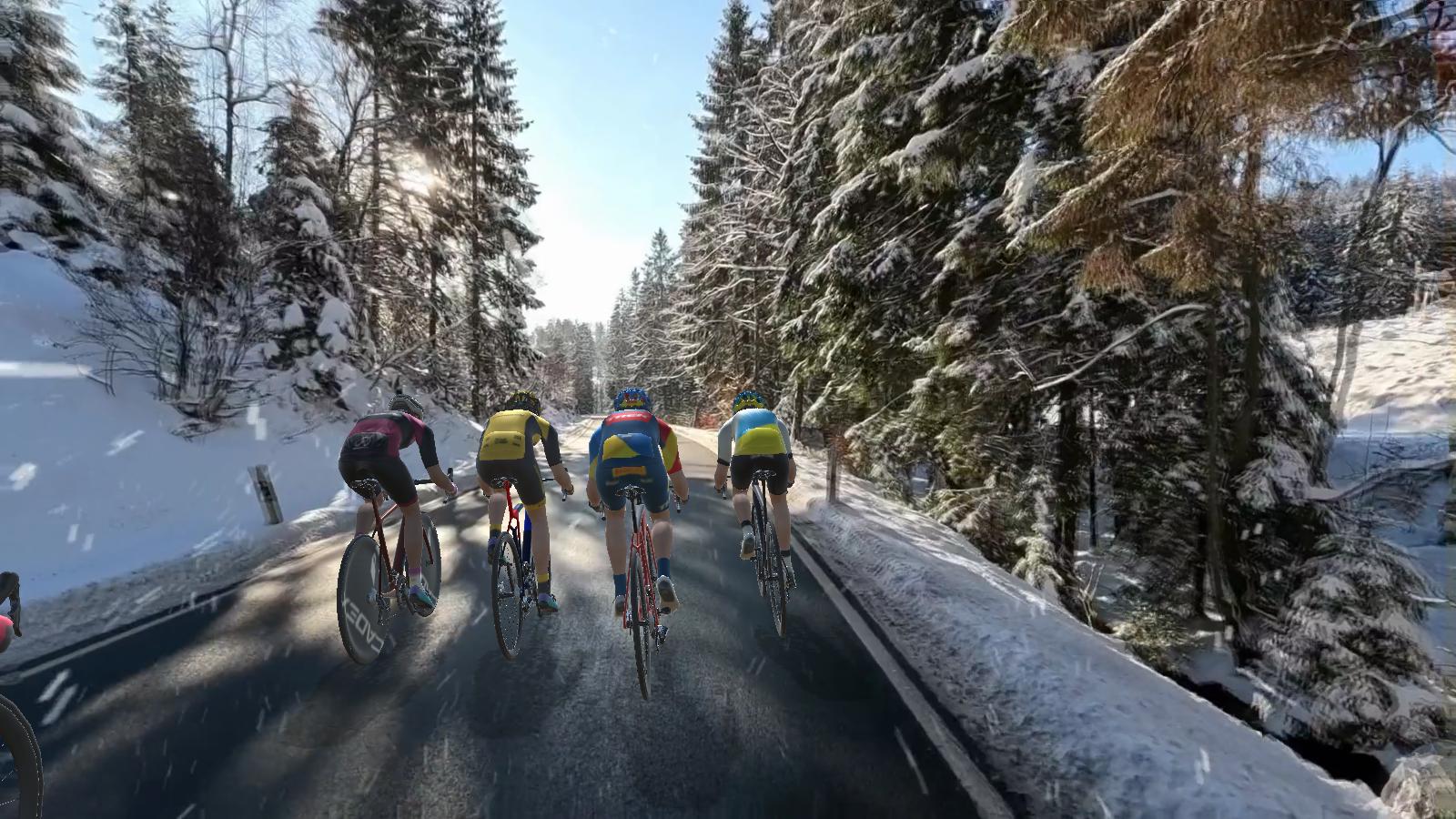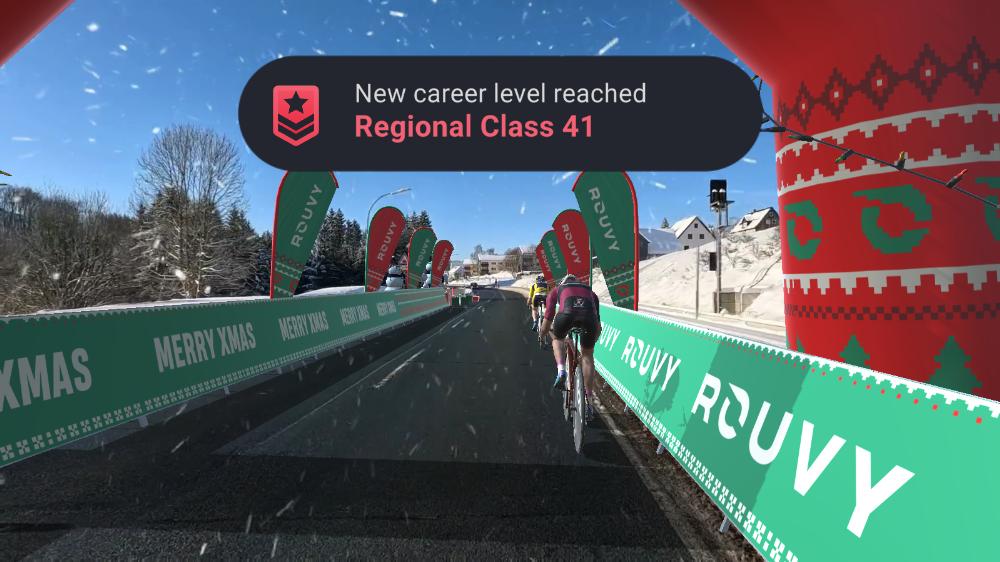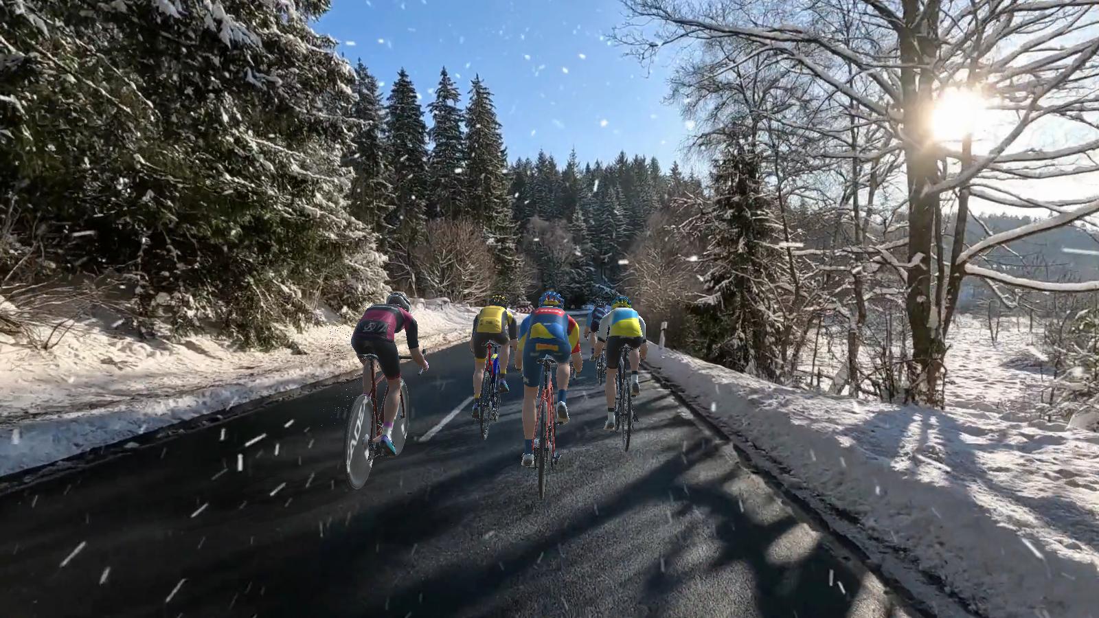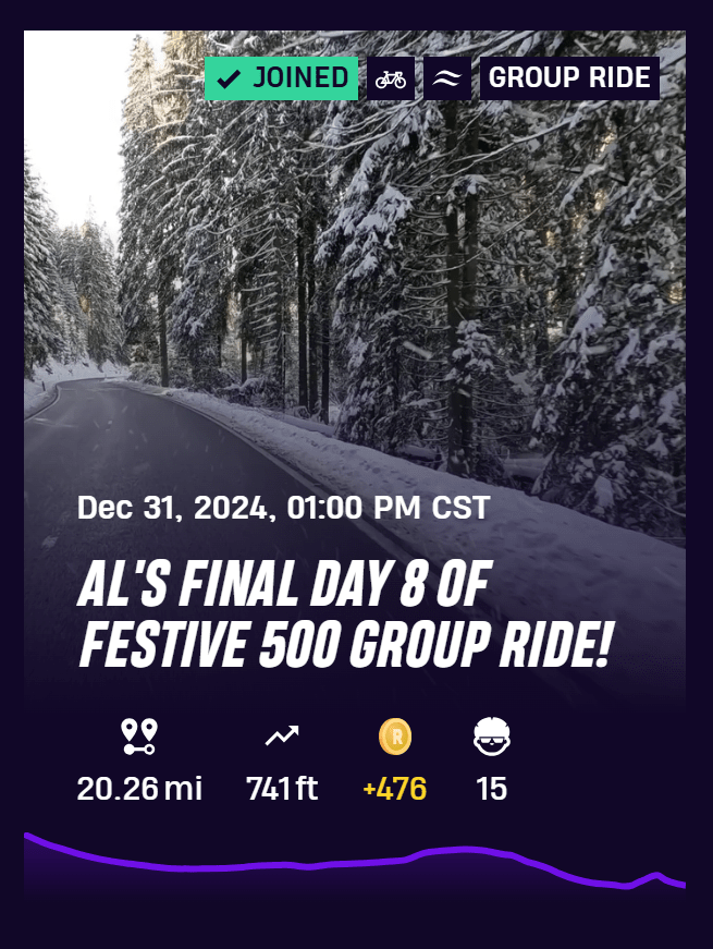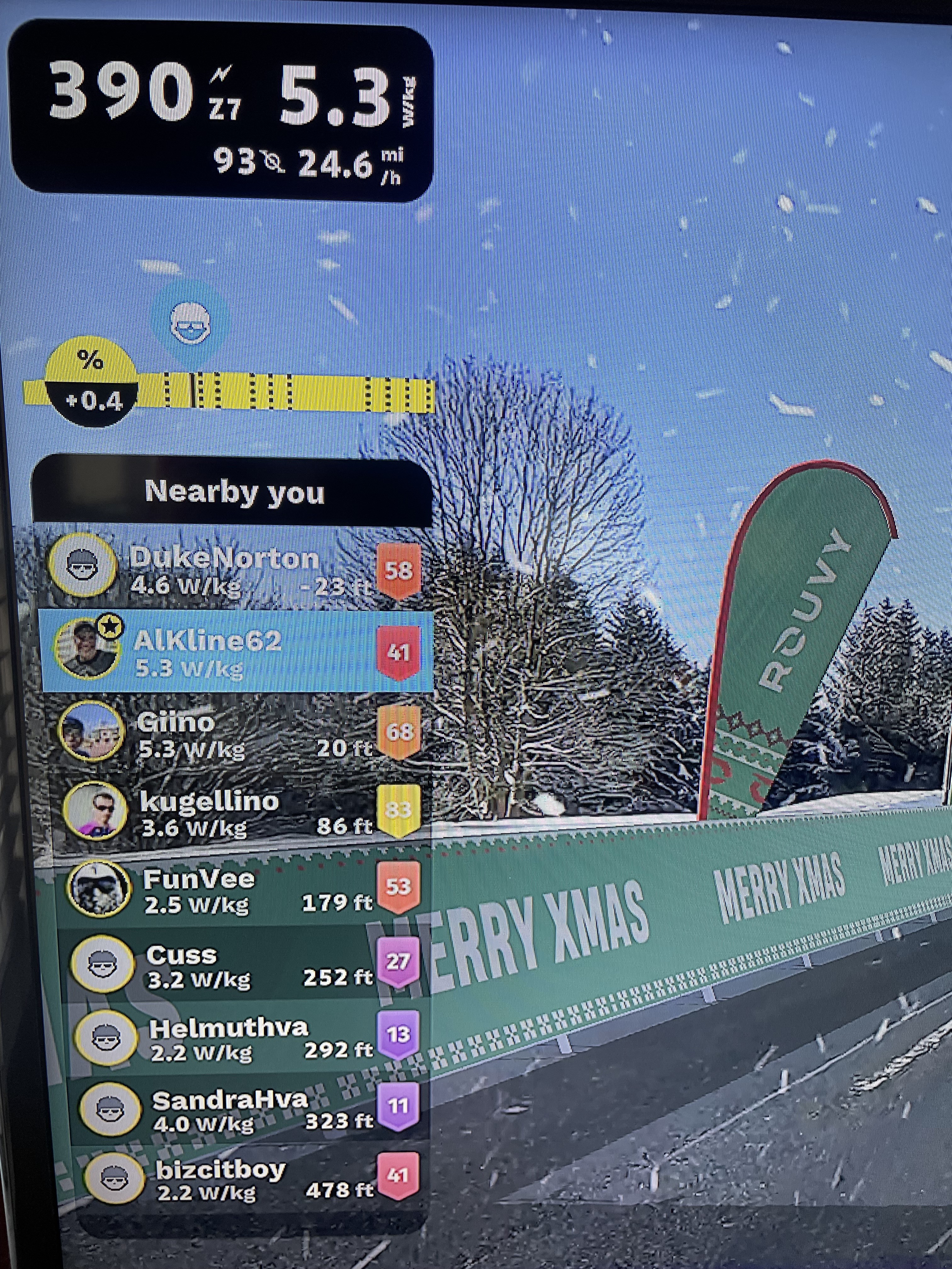 This new route in ROUVY is Christmas themed and mostly downhill with 2 climbs, one at the very end of the route. The group was mostly together, except for the uphills, which stretched out the peloton.