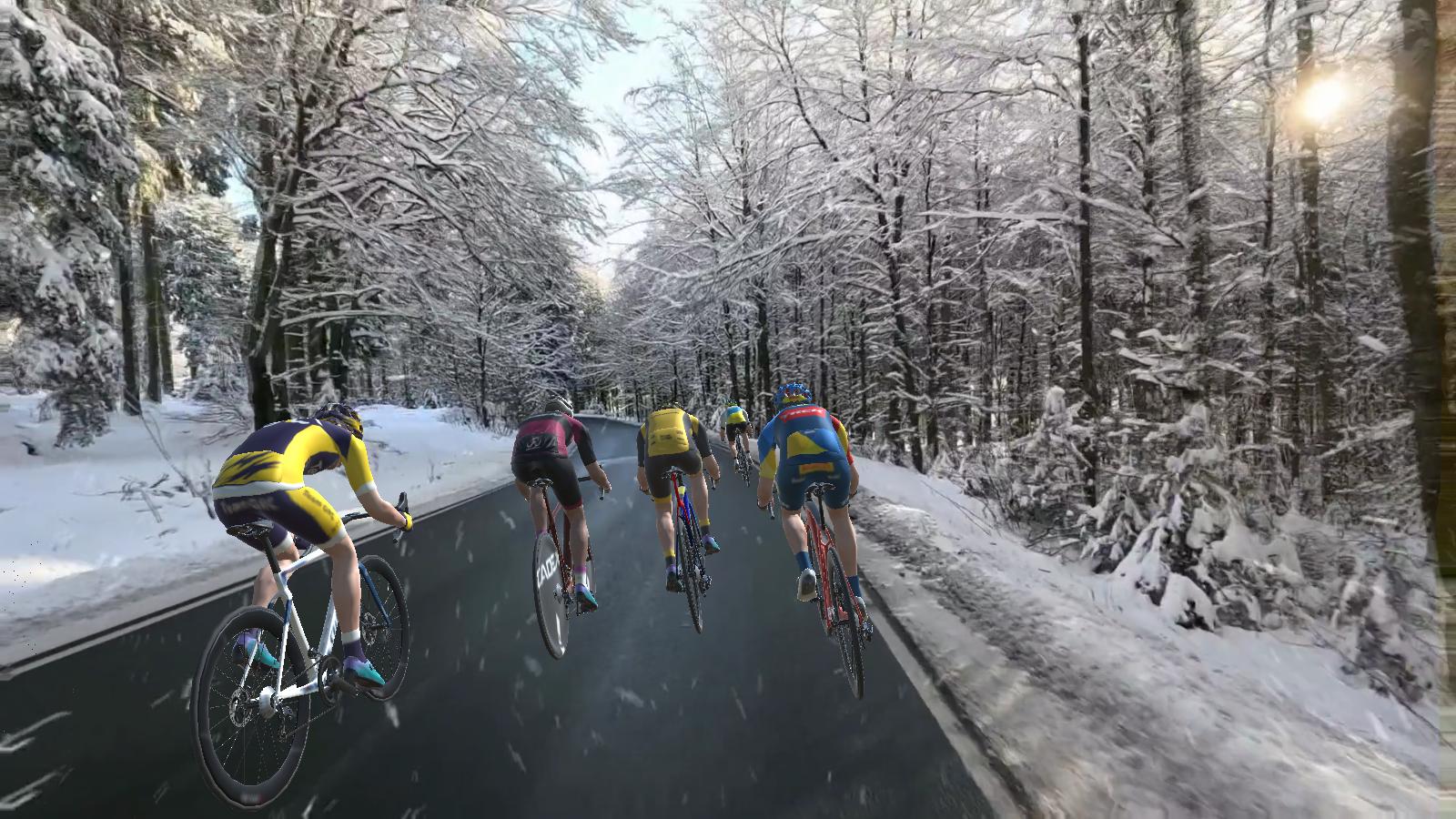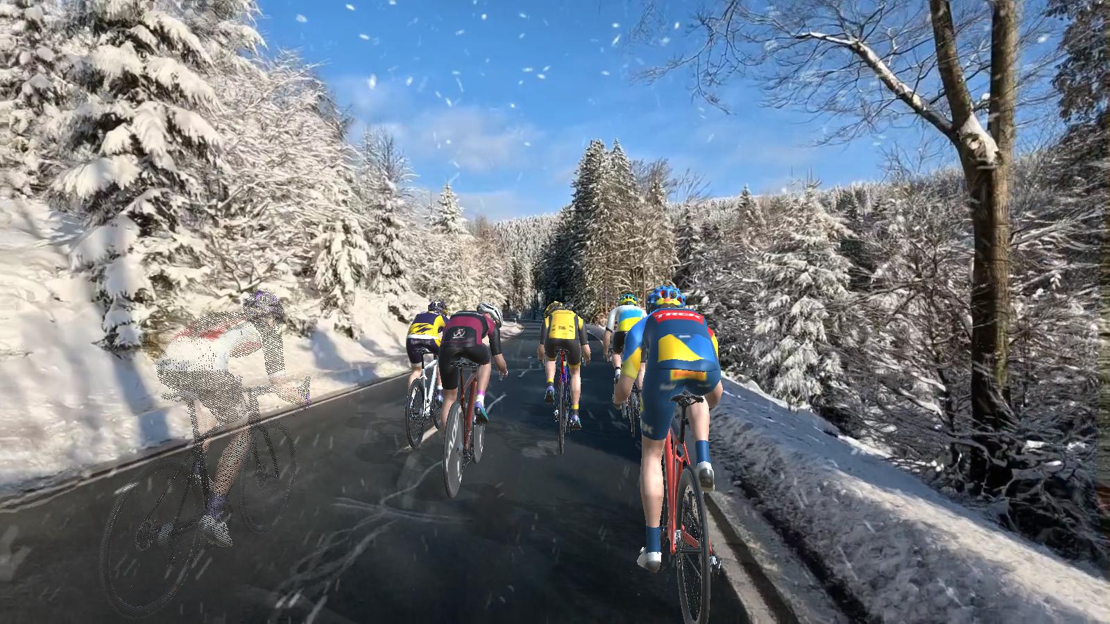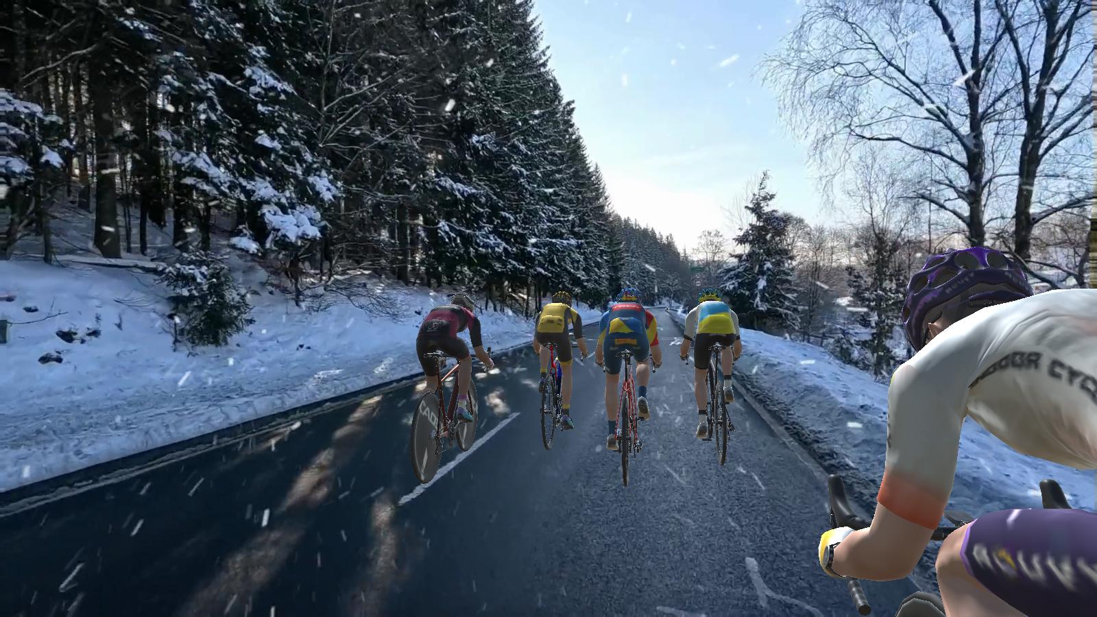 This new route in ROUVY is Christmas themed and mostly downhill with 2 climbs, one at the very end of the route. The group was mostly together, except for the uphills, which stretched out the peloton.