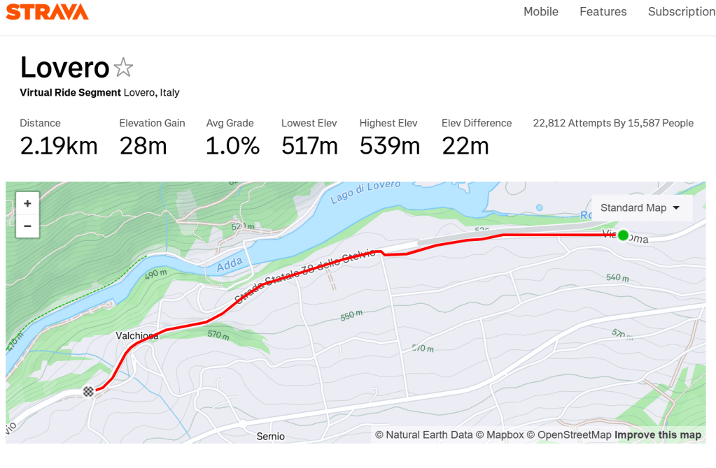 The Strava segment is Lovero measuring 6 only 2.19 KM with an elevation gain of 22 meters at about 1%. Most of this course if completely downhill.