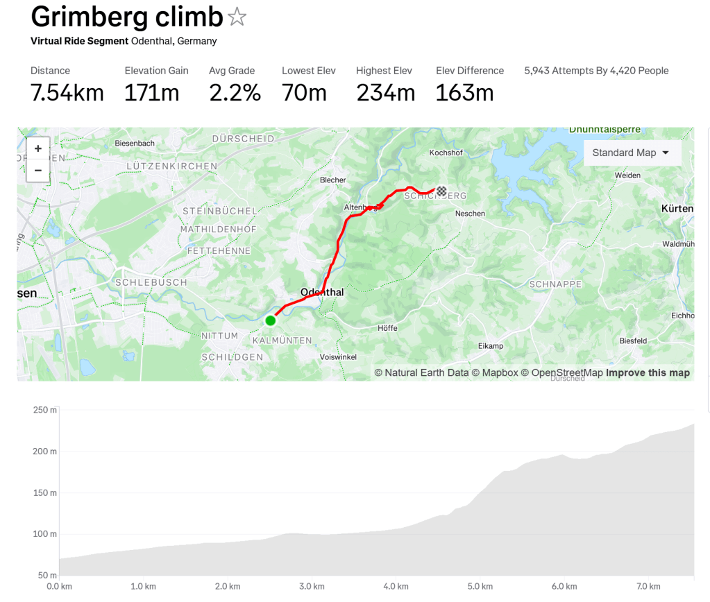 The Strava segment is the Grimberg Climb measuing 7.41 KM with a 2.2% avg gradient.