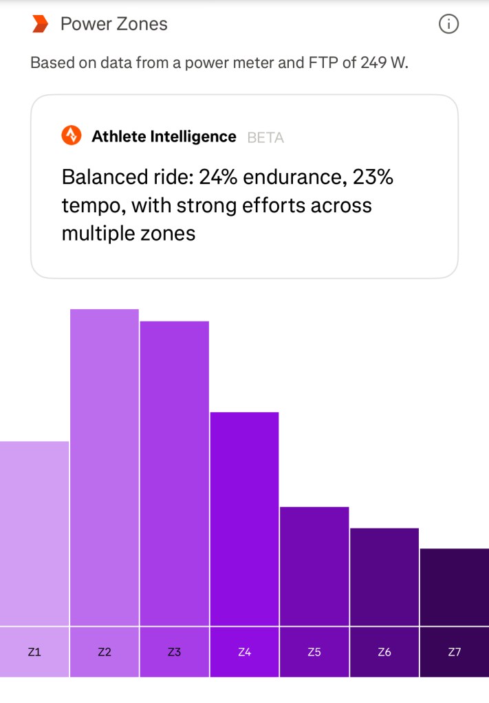 This was a Chill ride, so the ride was less intense ranging just under 3.0 watts/kg.