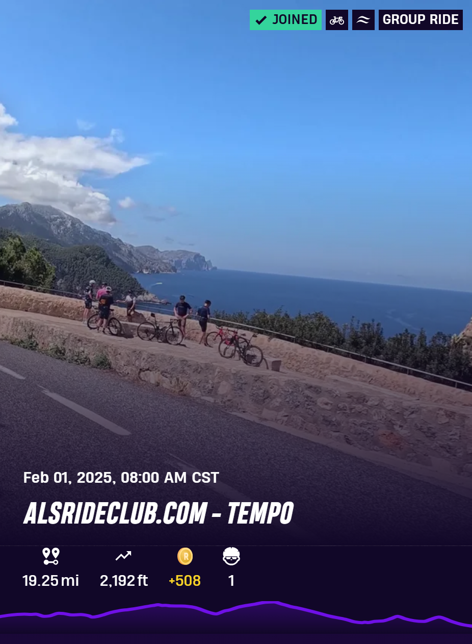 RIDE RECAP: Today, we rode a medium course climb in picturesque Mallorca, Spain. This was mostly a climbing course with lots of switchbacks and downhill breaks. We had about 10 or more Thanks to everyone who participated today!