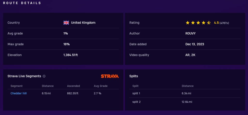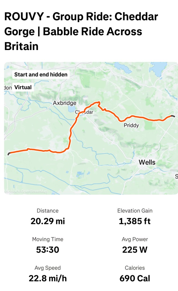 RIDE RECAP: Today, we rode the famous Cheddar Gorge in Britain! This is a medium course climb. This was part of the “Ride Across Britain” series, which includes courses such as Wye Valley, Glenshee, The Lecht, Cairngorm National Park, Strathnavar Valley and Bodmin Moor. Stay tuned for a week series in the near future for the entire series where we recreate the Babble Ride Across Britain! Thanks to everyone who participated today!