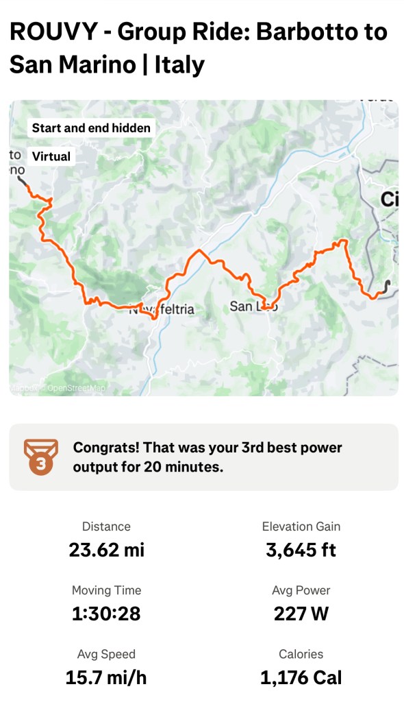 RIDE RECAP: Today kicks off the ITALY RIDE WEEK SERIES! This week, we ride some epic courses in ITALY! We start with a pretty tough little ride (Barbotto to San Marino | Italy), which has a lot of good, steady climbs. This was a medium distance CHILL climbing ride, trying to keep the group together at 2.5 to 3.0 w/kg.