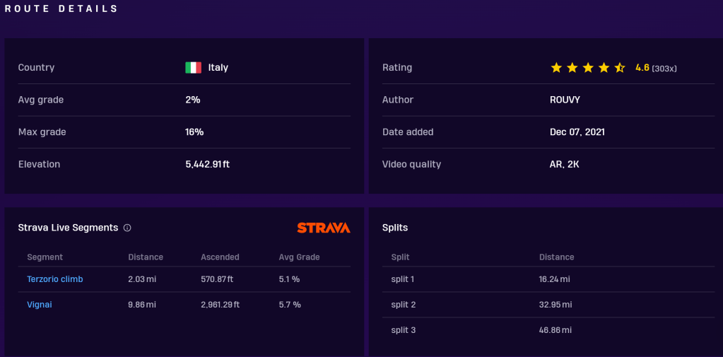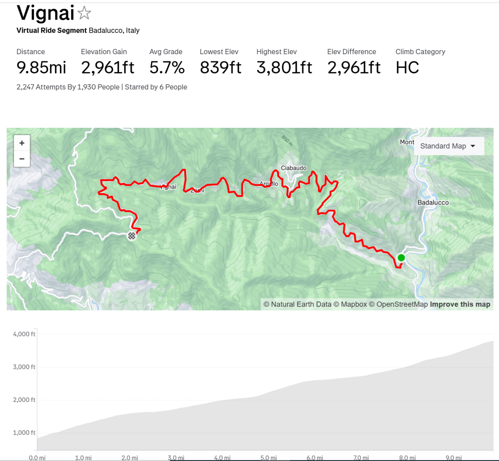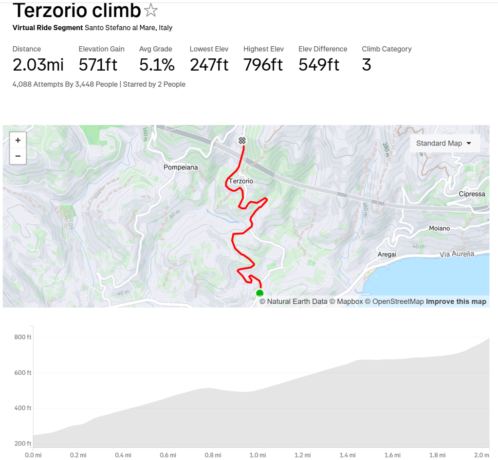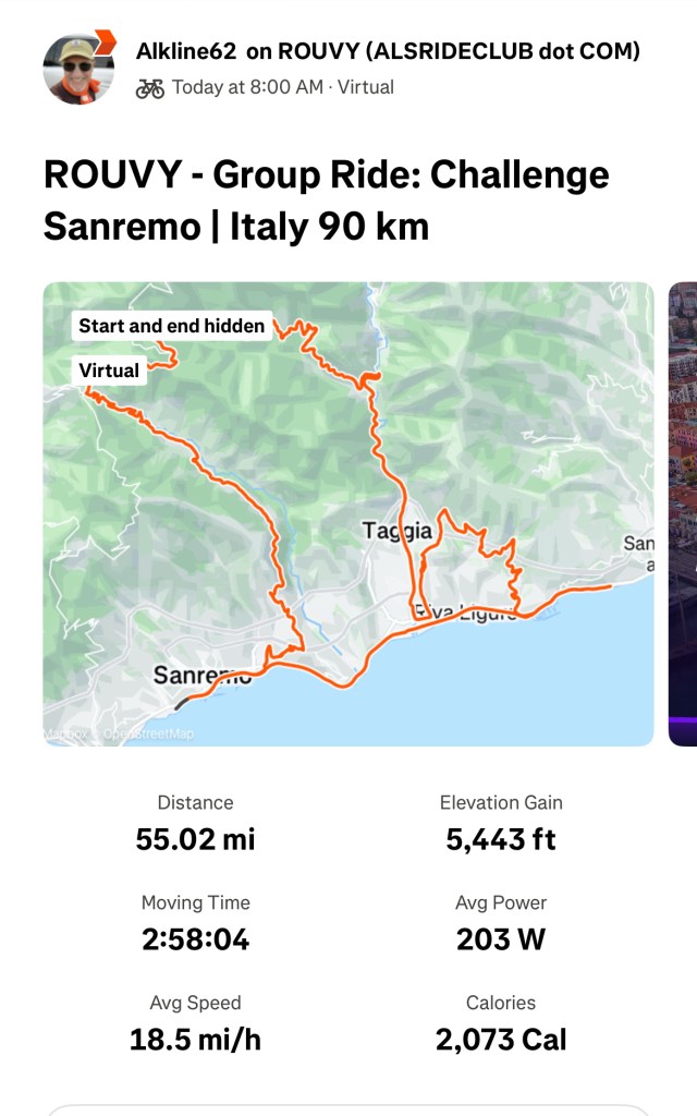 RIDE RECAP: This is our 4th day to the ITALY RIDE WEEK SERIES! This week, we again, ride some epic courses in ITALY! Today, we tackled the 55 mile (90km) ride “Challenge Sanremo” with it’s epic 10 mile climb at a 5.4% gradient. This is a long distance endurance ride, trying to keep the group together around 2.5 to 3.0 w/kg.