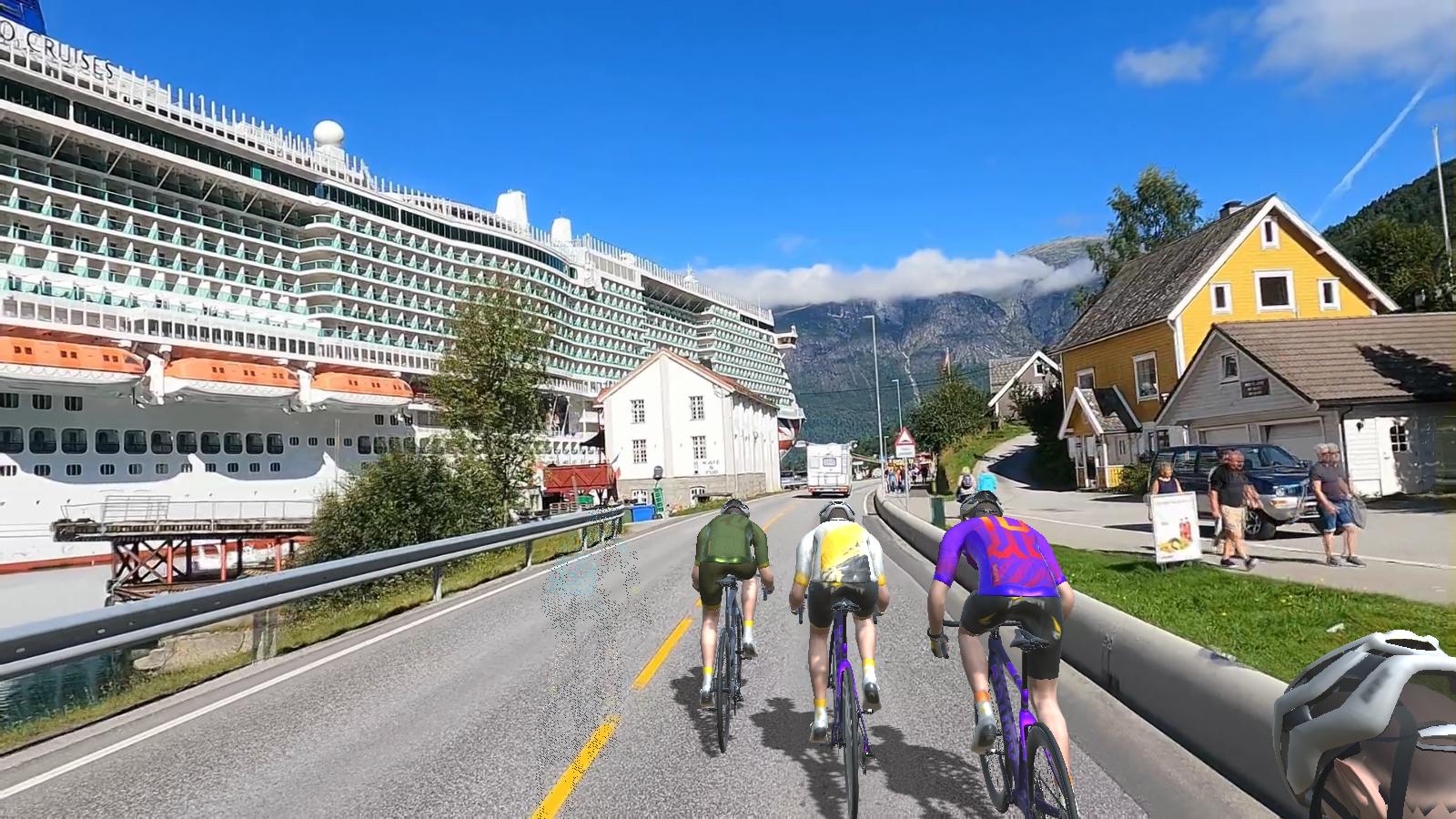 This was an amazing course with scenery and a beautiful cruise ship in harbor. lots of livestock, a roaring stream, amazing blue skies with scenic glaciers, definitely one of the nicest and prettiest courses on ROUVY!